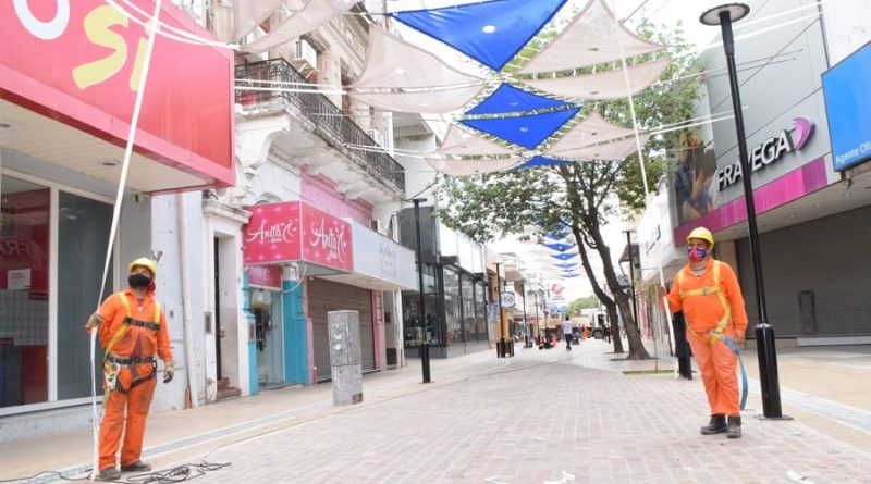 En el marco de la remodelación de la Peatonal Tucumán que lleva adelante la Capital, se está ejecutando la instalación del novedoso toldo vela para otorgar mayor superficie de sombra a uno de los sectores de mayor concurrencia de la zona comercial.