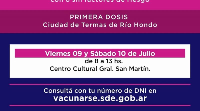 07.07.21- Siguiendo la importante campaña de vacunación que se impulsa en todo el territorio provincial, este 09 y 10 de Julio, de 8 a 13 hs., el Centro Cultural General San Martín, será de la Vacunación COVID – 19 para personas de 25 a 29 años, con y sin factores de riesgo.