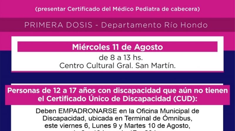 - Llamado a empadronarse a Personas con Discapacidad (de 12 a 17 años) que no tengan CUD (Depto. Río Hondo). El empadronamiento comienza a partir de este viernes 6 de agosto de 8 a 13 y de 17 a 20 hs, en la Oficina de Discapacidad que se encuentra ubicada en la Terminal de Ómnibus.