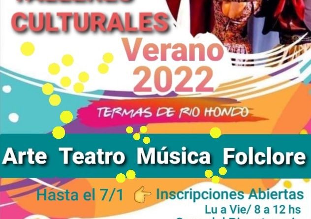 30.12.21- Desde la Municipalidad de Las Termas de Río Hondo, a través de la Dirección de Cultura Municipal, se informa a la comunidad que se encuentran abiertas las inscripciones desde el 30 de Diciembre de 2021, hasta el 7 de Enero de 2022, para los Talleres Culturales de Verano 2022.