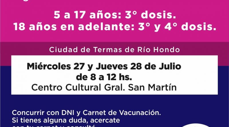 Leer más26.07.22- La actividad vacunatoria se desarrollará en las instalaciones del Centro Cultural Gral. San Martín y se desarrollará este miércoles