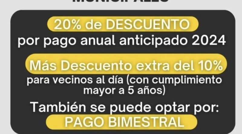 20% de #descuento por #PagoAnual anticipado de tasas y contribuciones municipales 2024. 10% de #DescuentoExtra para los contribuyentes que mantienen el pago al día (con cumplimiento mayor a 5 años).Nueva posibilidad de optar por pago bimestral.Vencimiento: 24 de mayo de 2024.